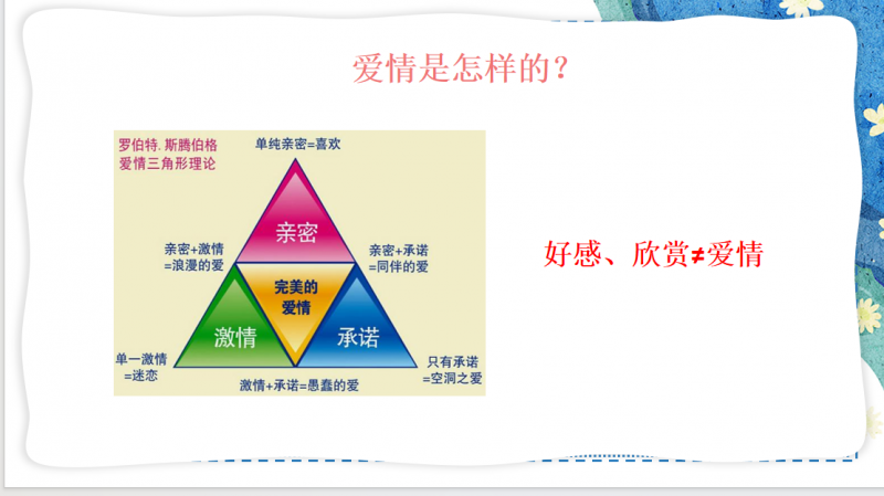 在情景演绎的基础上,王老师启发学生归纳青春期的恋爱特点,即缺少承诺,难以持久;过度狂热和痴迷,影响身心健康和学业;出现问题时,易产生偏激行为;自制力差,未经引导,难以承担后果。并用具体事例阐述说理,揭示早恋的危害性。王老师又再次通过提问让学生先对比喜欢和爱的区别,并用视频让学生切身体会两种情感的不同。王老师相机指出,真正的爱情需要稳定的三角结构,亲密、激情、承诺缺一不可,点明现今中学生最缺乏的就是承诺,因此,好感、欣赏并不等于爱情。